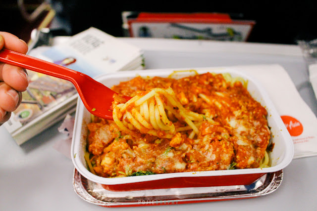 Enjoying my onboard meal – spaghetti bolognese. Nyumy! TQ AirAsia