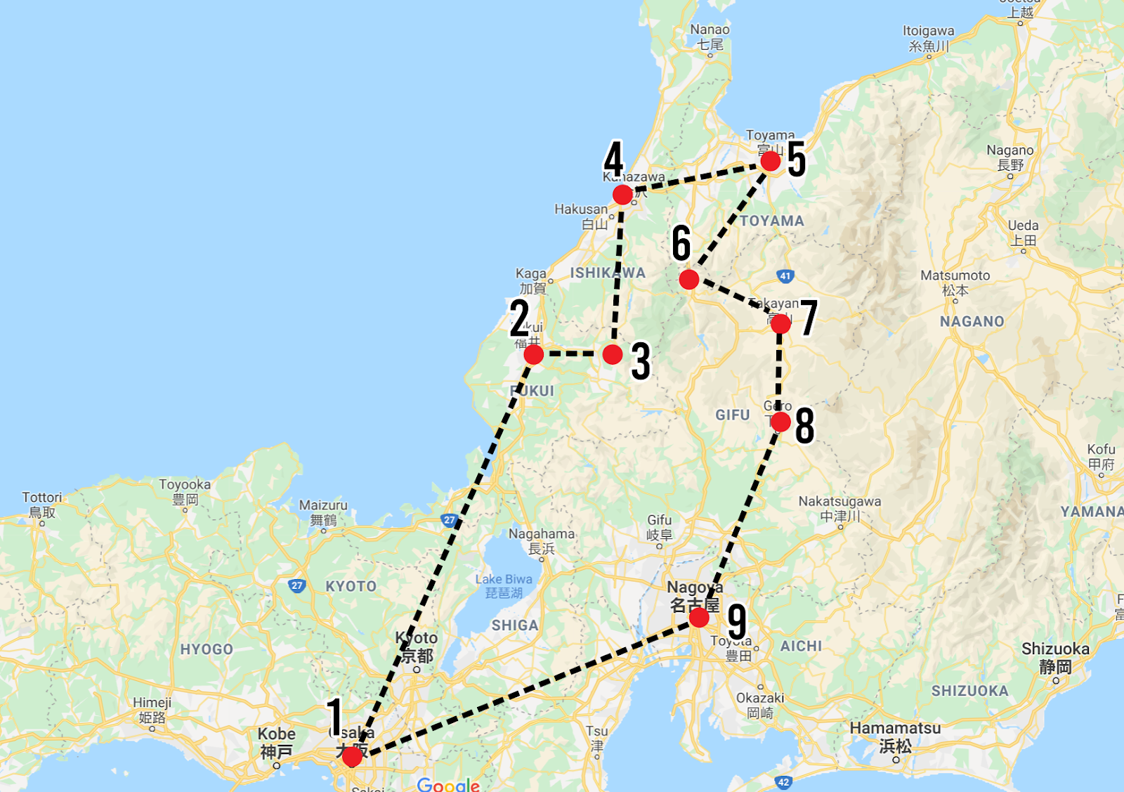 Perjalanan dimulakan dari Osaka (1), ke Fukui (2), Katsuyama (3), Kanazawa (4), Toyama (5), Shirakawa-Go (6), Takayama (7), Gero (8), Nagoya (9) dan seterusnya balik semula ke Osaka.