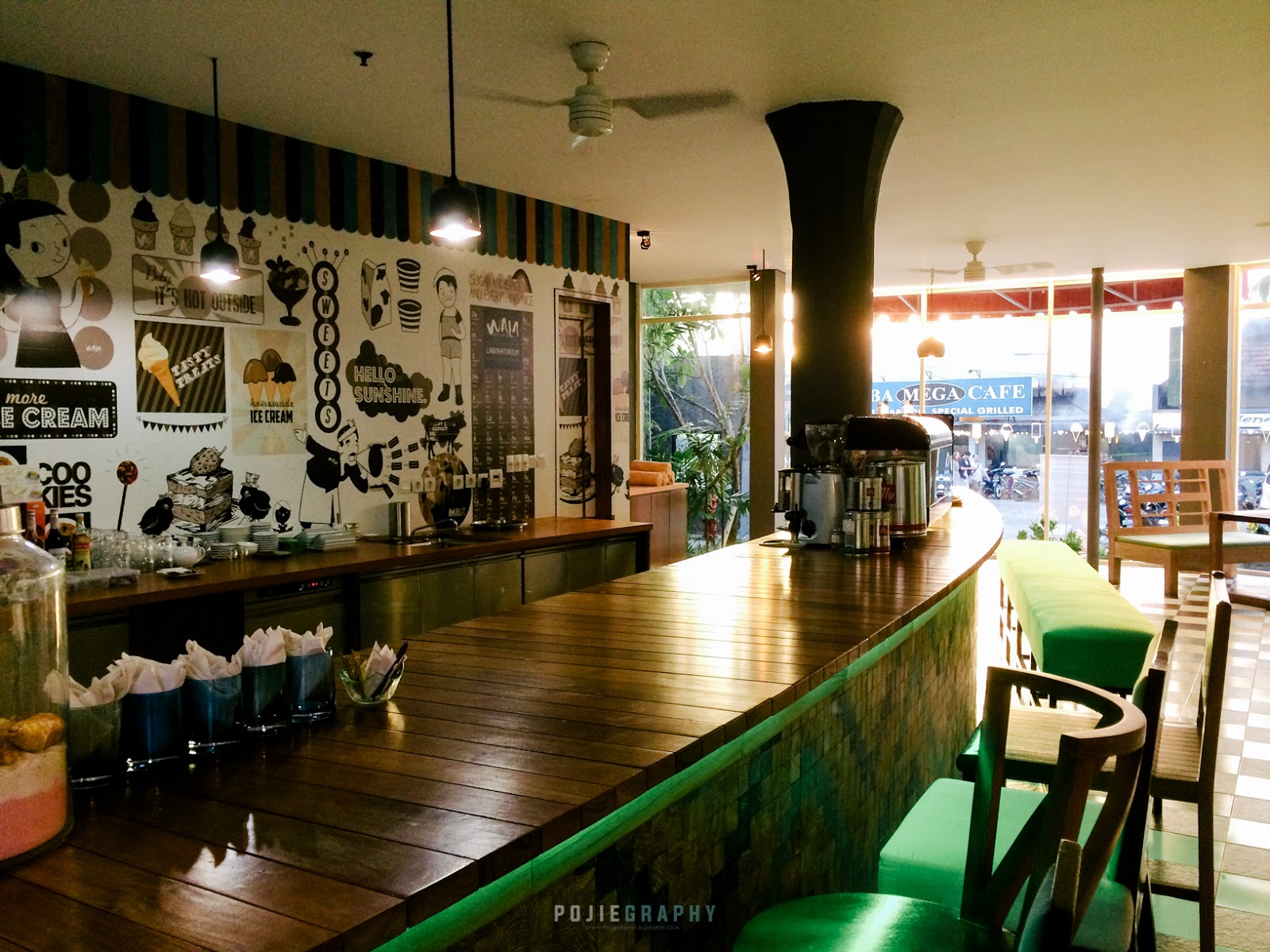 Restoran yang mempunyai sekitar 120 tempat duduk ini juga terkenal dengan hidangan singaturenya seperti Balinese chicken curry omelette, Padang beef rendang poached egg dan banyak lagi.
