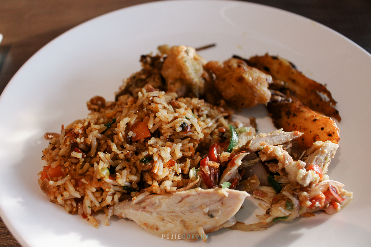 Fried chicken, kuey teow, cheezy bread and special fried rice with juicy meat