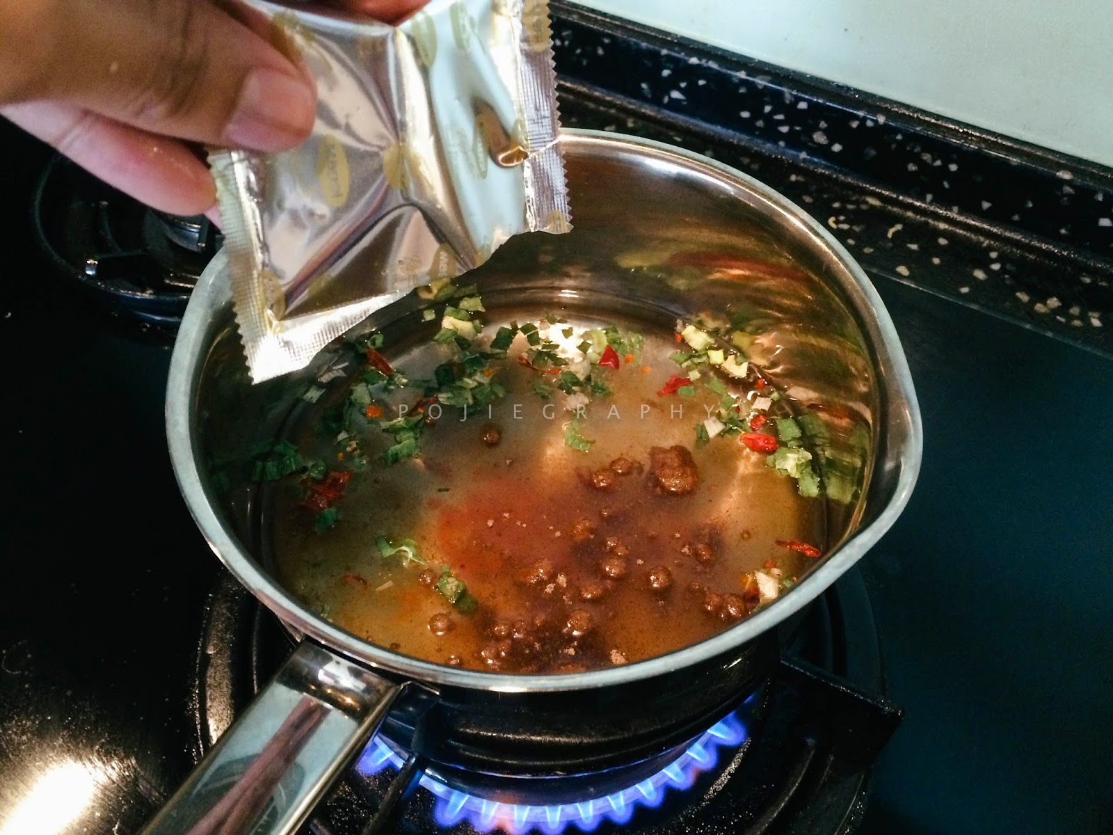 Isi dengan air baru and panaskan sehingga mendidih before masukkan serbuk perencah tu.