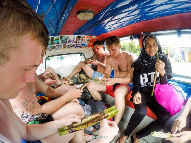 On the way back, our driver dropped by a food stall and bought a food (it looks like otak-otak that we have in Malaysia) but the filling is like fried coconut dodol or something. It was our first time trying this food and we couldn’t explain to these British guys about its name. Thats all for this entry and i’ll write more Krabi experience in my next entry. See ya!